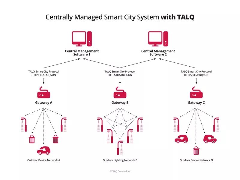 由于大多數可用的解決方案目前是專有的,專注于數據收集后,TALQ聯盟決定大力發展智能城市議定書團結一切智慧城市的要求,包括設備調試,數據采集,配置,控制,指揮,監控,以及計劃程式。由于該軟件協議,該聯盟表示,城市現在可以選擇來自多個供應商的設備聯網解決方案,并通過單個中央管理軟件實例控制它們。